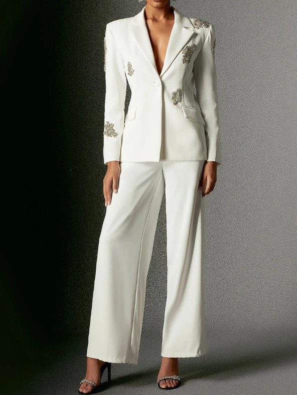 Elegant ladies‘ trouser suit Elora in white with pearl appliqués