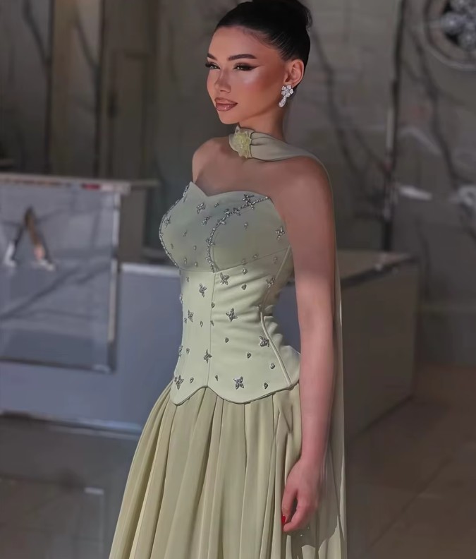 Schulterfreies A Linie Brautkleid Darleen in hellgrün mit Strass Applikationen