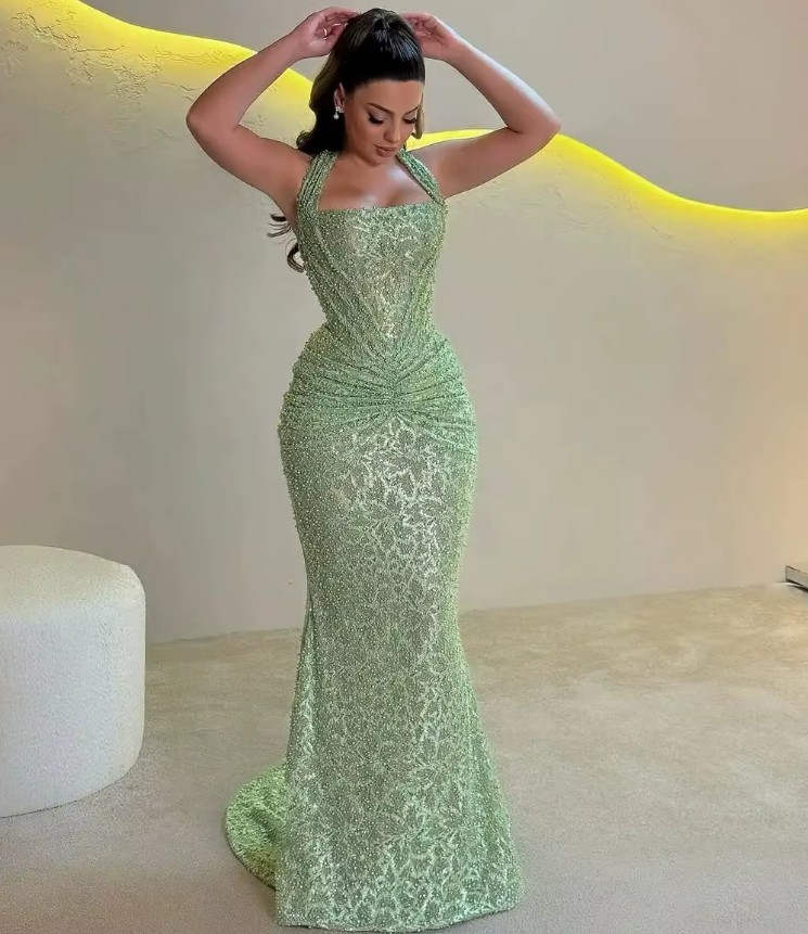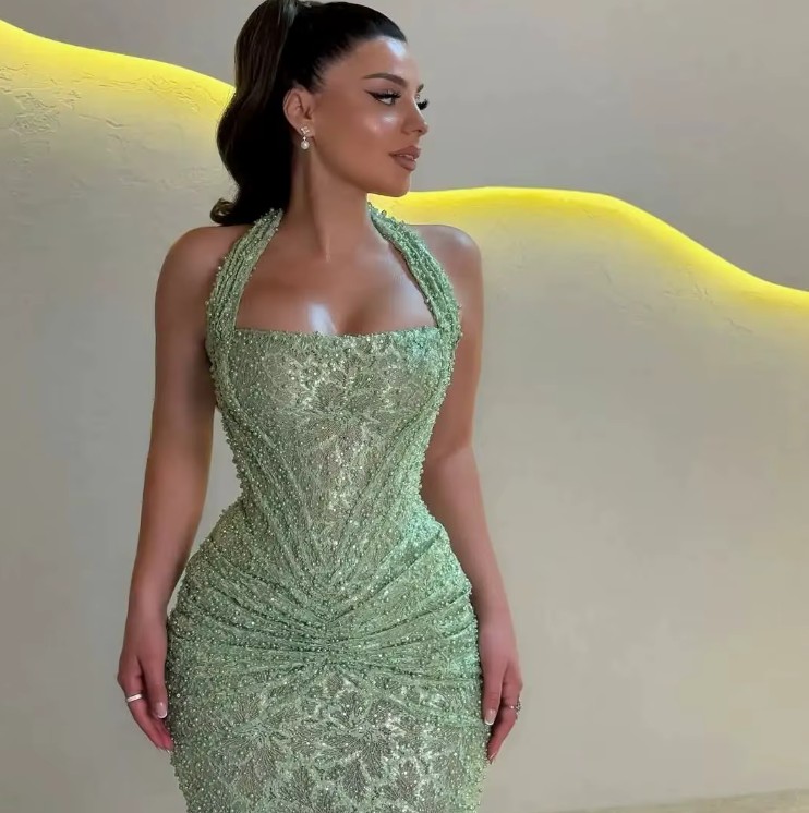 Halter straps fit and flare evening dress in mint green with pearl rhinestone appliqués