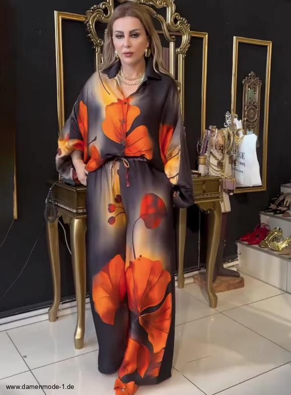Eleganter Zweiteiler Damen Outfit in Schwarz mit Blumenmuster