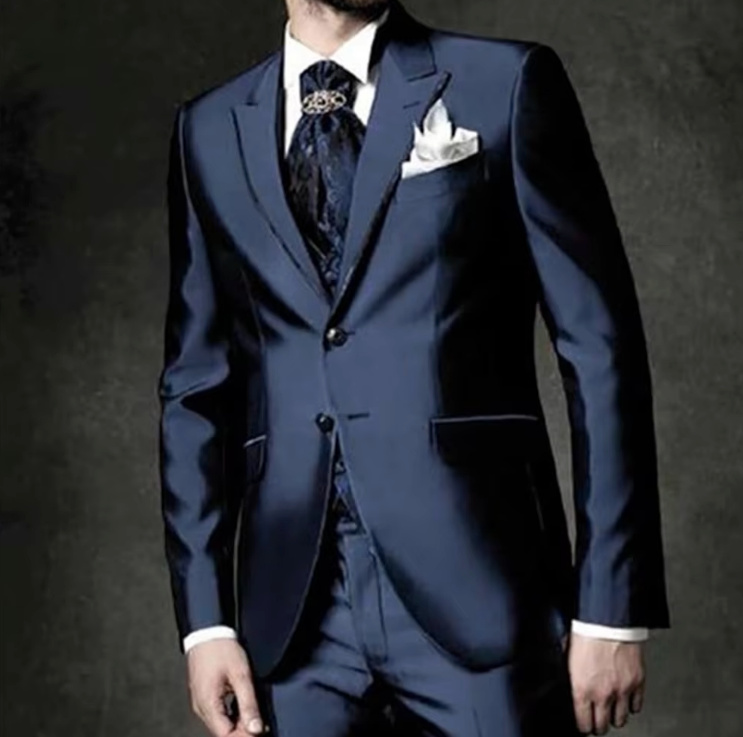 Satin men’s suit tuxedo for the groom and wedding guests in navy blue three-piece jacket waistcoat and trousers