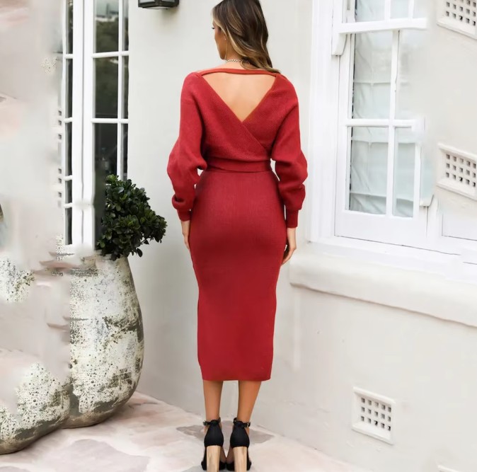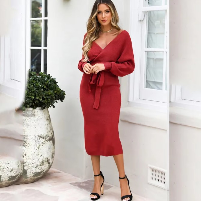 Langarm Wickel Strickkleid Eve mit V Ausschnitt Rot