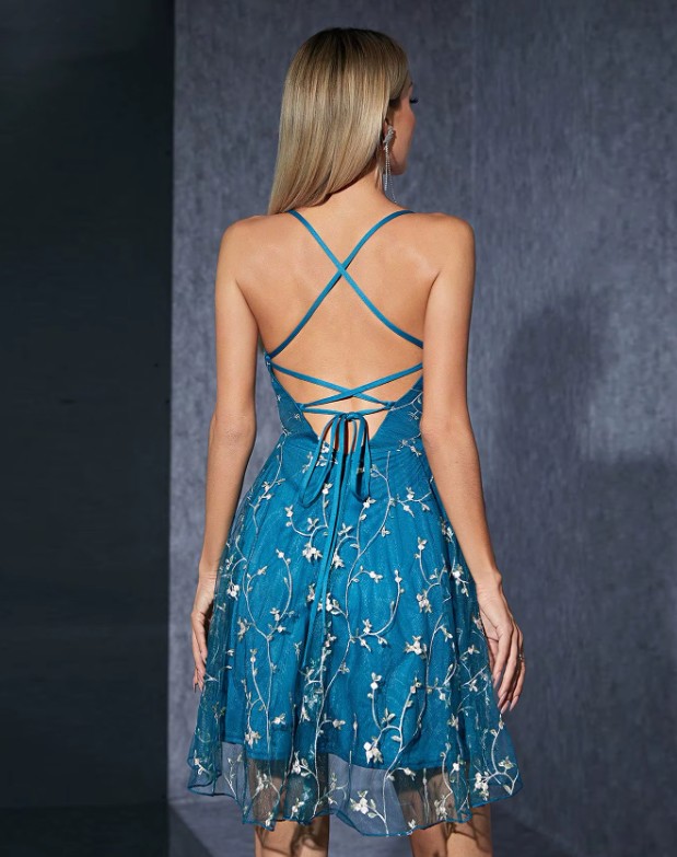 Neckholder Kleid Ivy für Hochzeitsgäste in Blau Kurz mit Spitze