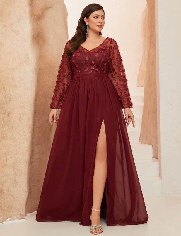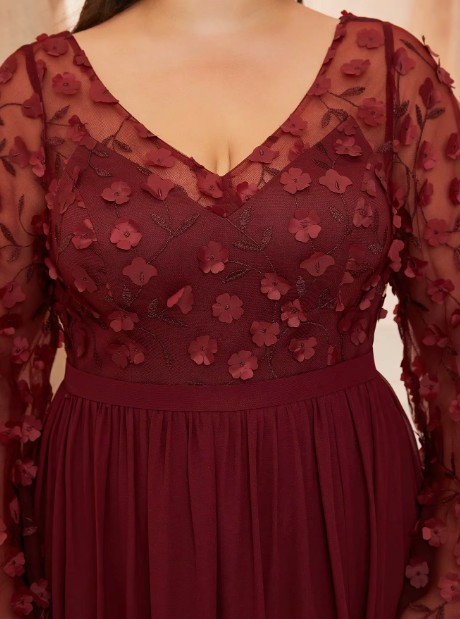 A-line long-sleeved dress as a wedding guest in dark red with lace