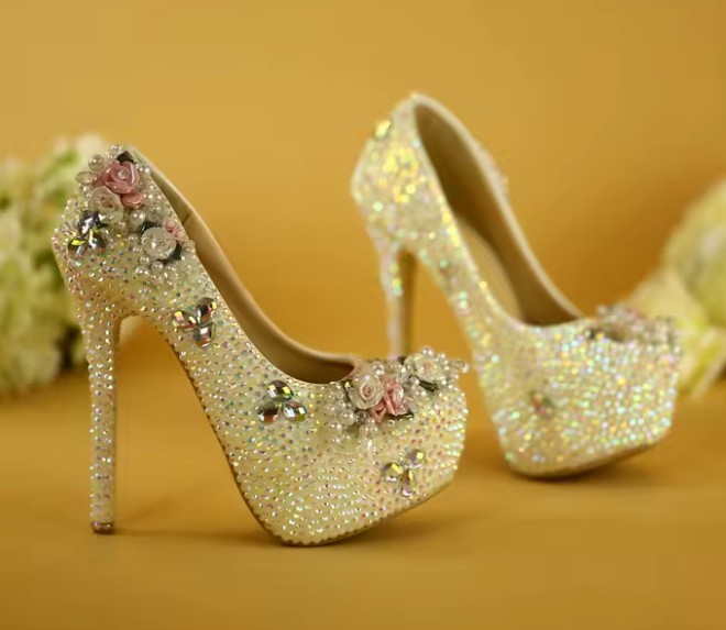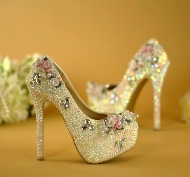 Glitter pearl bridal shoes with 3D resin flowers heel 6 – 14 cm