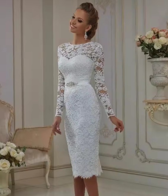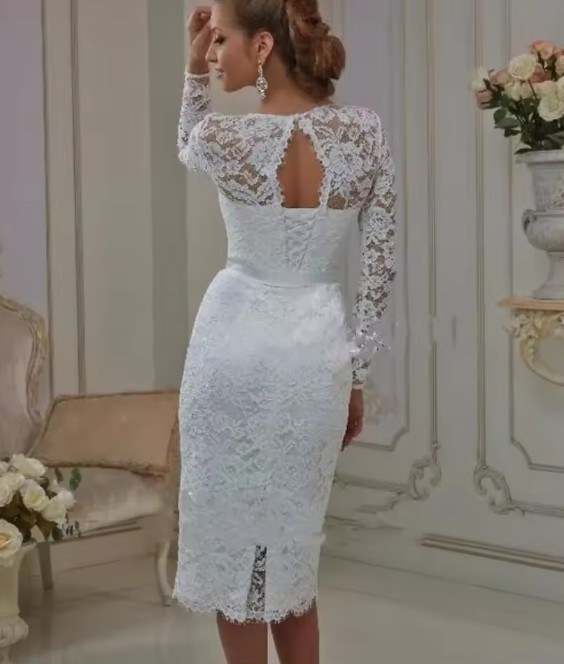 Long-sleeved I-line wedding dress Iva calf-length made of lace