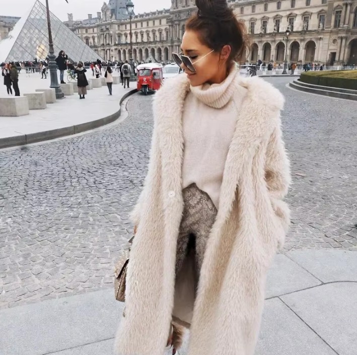 Lange Teddy Plüsch Mantel Elanie in Beige