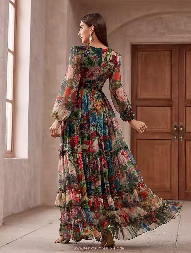 Langarm Chiffon Kleid Cynthia Elegant für Hochzeitsgäste Bunt mit Blumenmuster