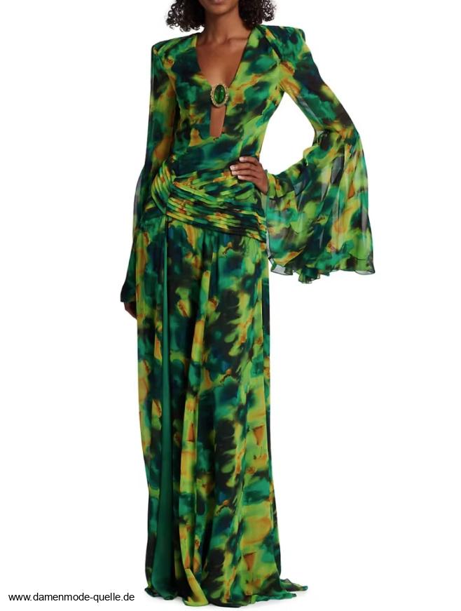 A-Linie Chiffon Kleid Elegant mit Rückenausschnitt in Grün mit Muster