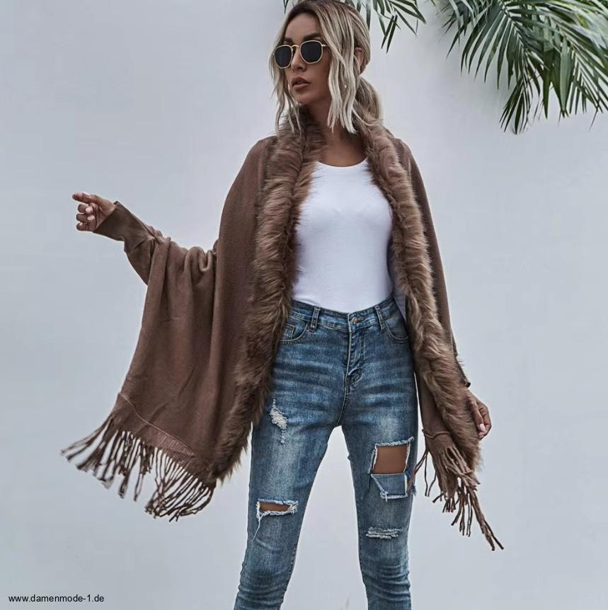 Damen Strickjacke Cardigan Caja mit Plüsch Kragen in Braun