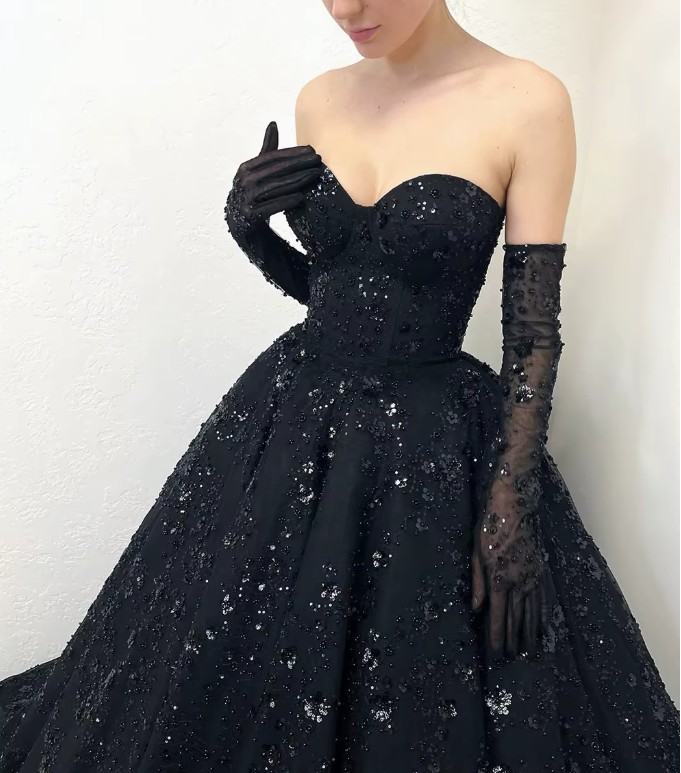 Glitzer Githic Stil Brautkleid Schulterfrei Indira Schwarz