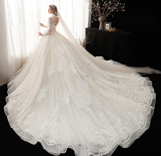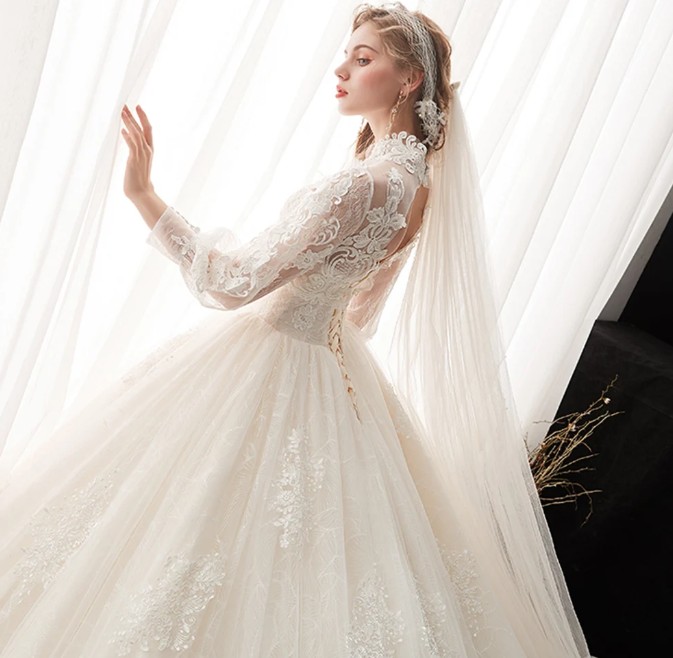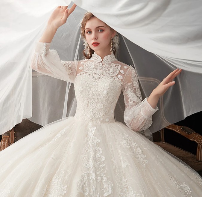 Langarm Perlen Blumen Brautkleid Idabella mit Schleppe