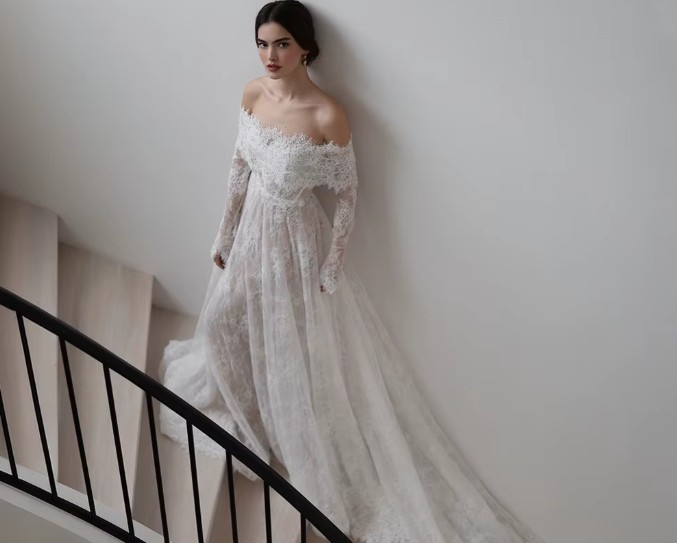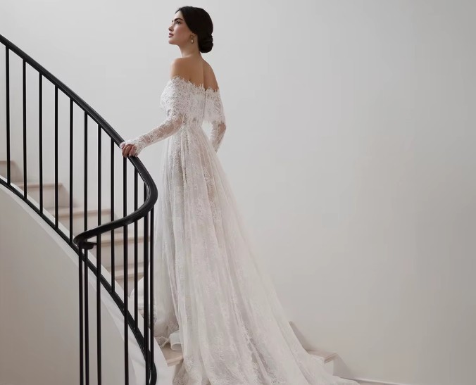 Off-the-shoulder A-line long-sleeved lace wedding dress Isabel with train