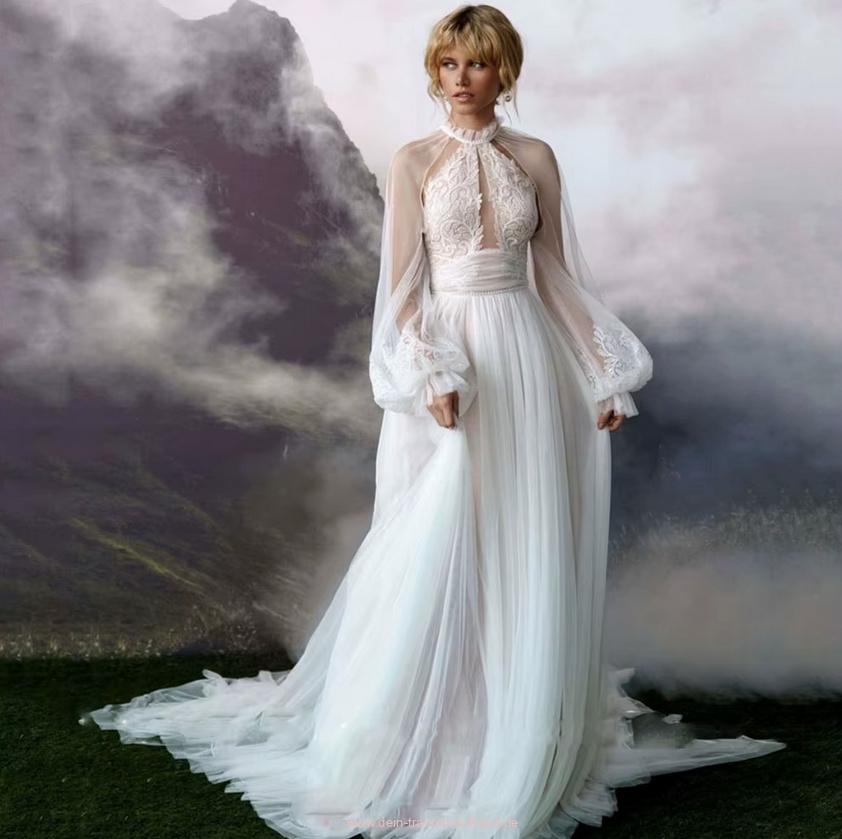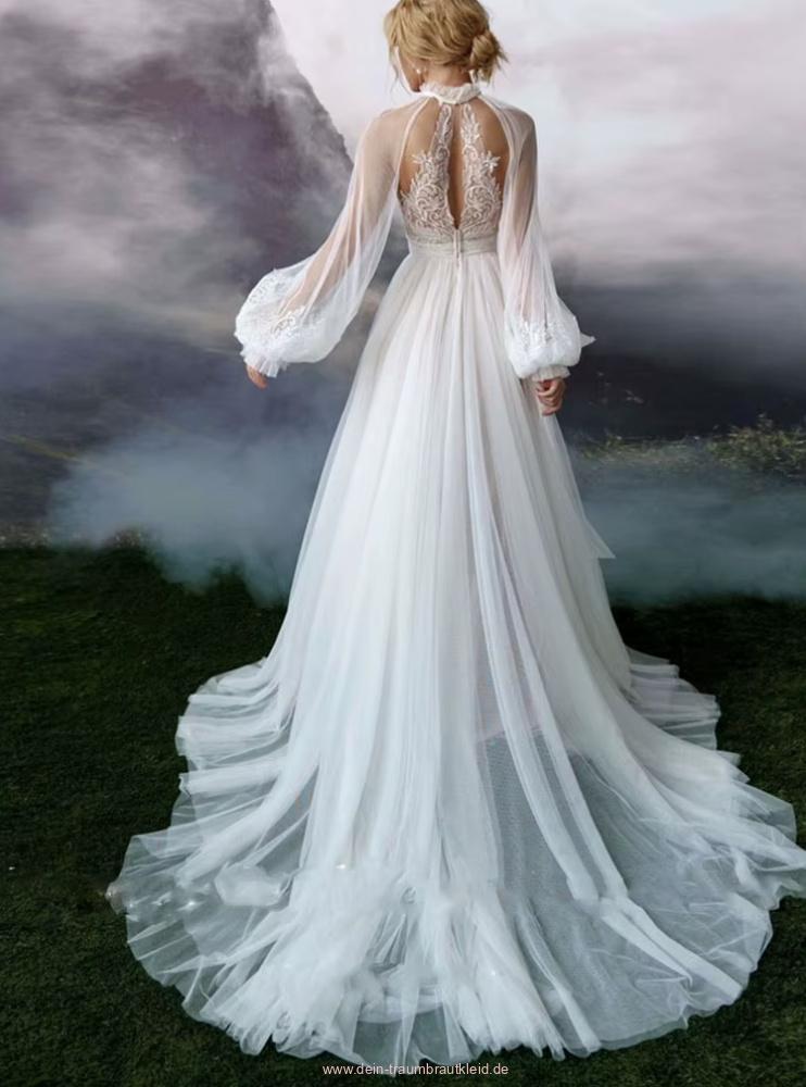 A Linie Boho Brautkleid Gemma mit Spitze Tüll Ärmeln und Rückenausschnitt