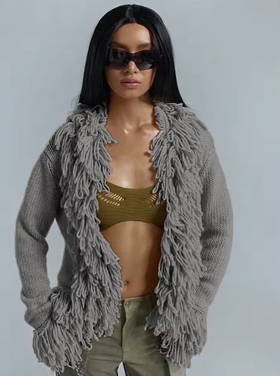 Damen Strickjacke Eloise Cardigan mit Franzen in Grau