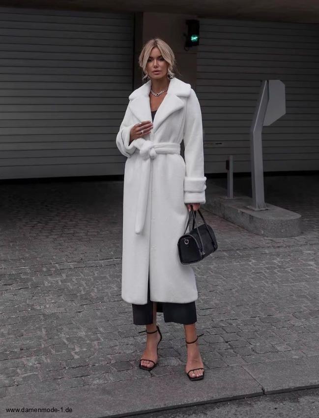 Langer Wintermantel Flauschig zum Binden in Weiß