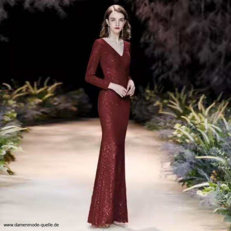 Pailletten Langarm Abendkleid 2025 mit V Ausschnitt in Weinrot