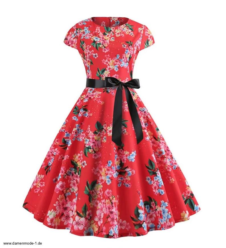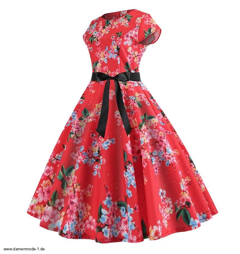 A Linie Vintage 60er Rockabilly Kleid Callisto Knielang Rot mit Blumenmuster