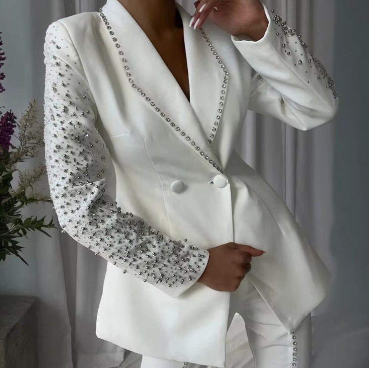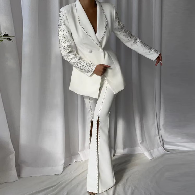 Bridal outfit two-piece trouser suit for the registry office with rhinestone pearl applications
