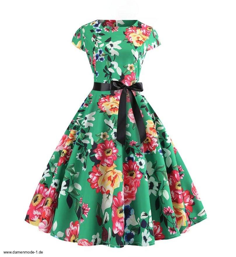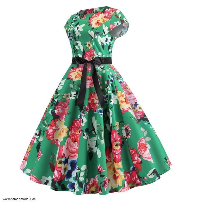 A Linie Vintage 60er Rockabilly Kleid Clementine Knielang Grün mit Blumenmuster