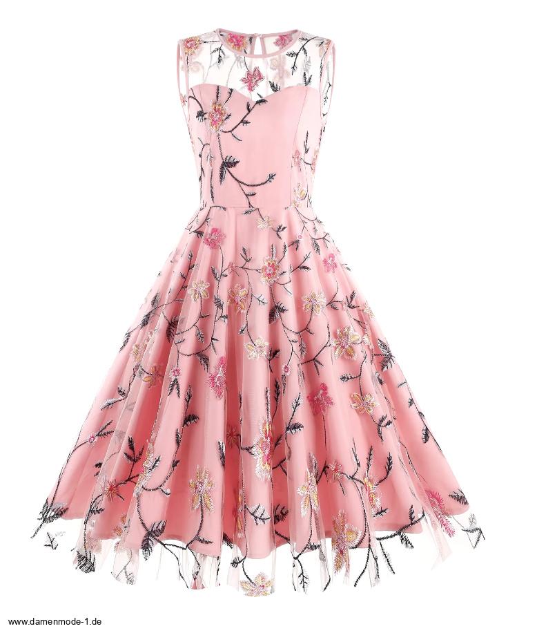 Ärmelloses Vintage Rockabilly Kleid Knielang in Rosa mit Blumenstickereien