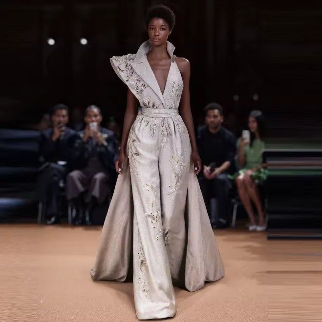 Luxury satin bridal jumpsuit one-piece for the registry office with embroidery