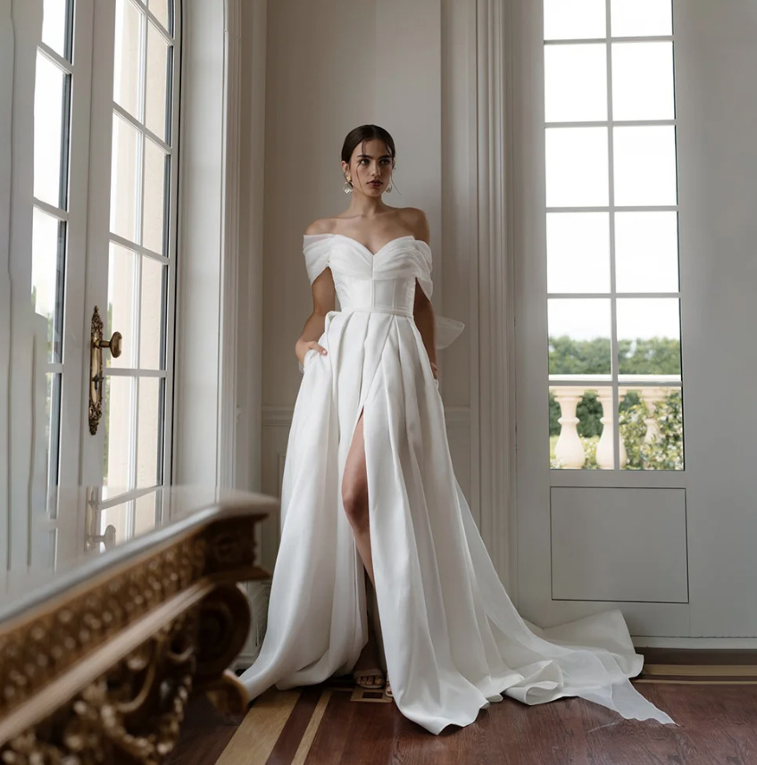 Off-the-shoulder A-line wedding dress Alva Modern with train