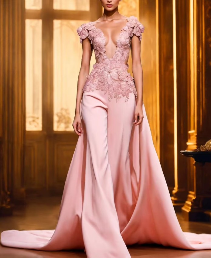 Bridal Jumpsuit Josie in Pink with 3D Flower Train Detachable
