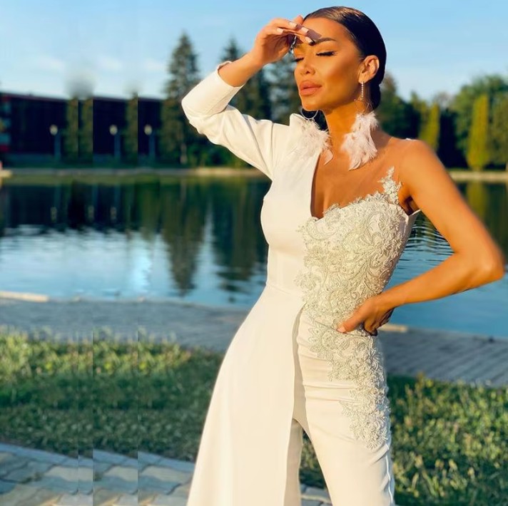 Bridal one-piece jumpsuit for the registry office asymmetric in white