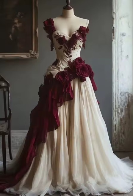Vintage style wedding dress Juliena Ivory Wine Red with 3D flowers
