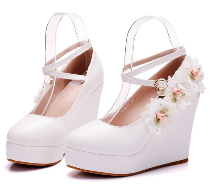 Platform wedge heel bridal shoes wedding shoes white with satin flowers