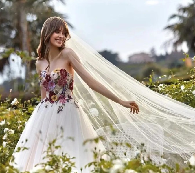 Schulterfreies Brautkleid Irene mit Bunte Blumen