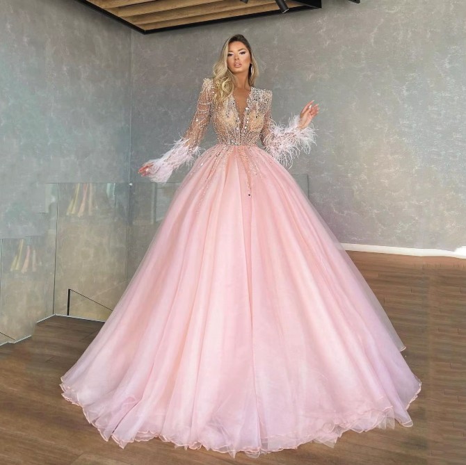 A-line long-sleeved wedding dress Ike in soft pink with rhinestone appliqués