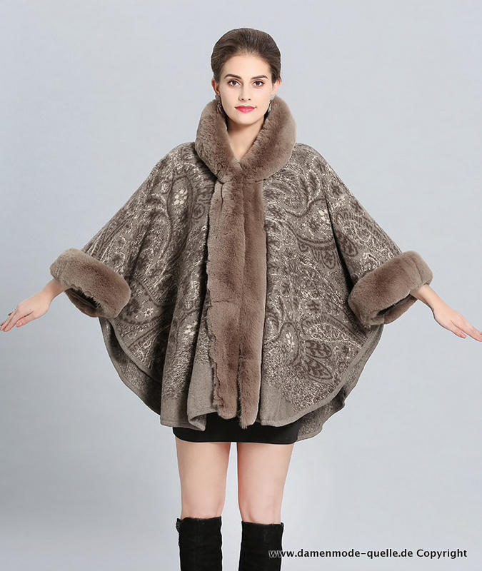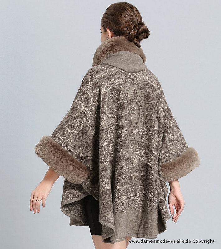 Damen Winter Poncho Bestickt in Bronze Braun mit Kunstpelz