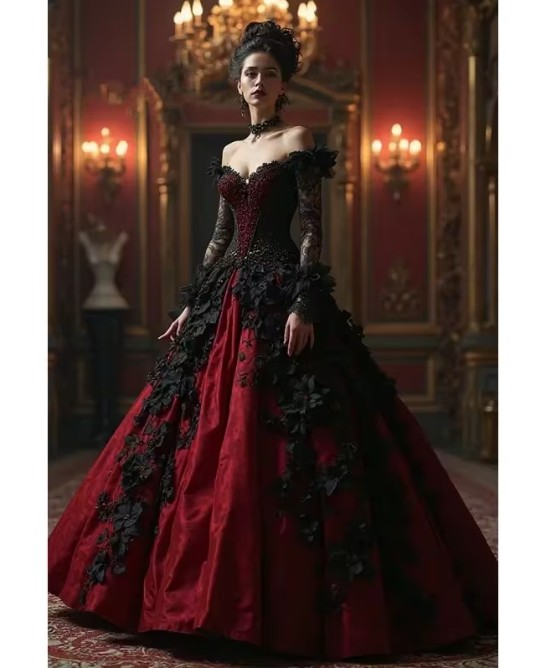 Off-the-shoulder Victorian wedding dress Evelyn in red and black with floral appliqués