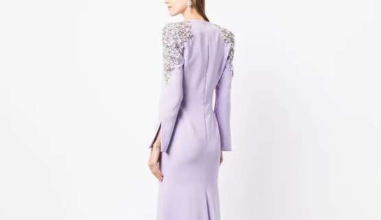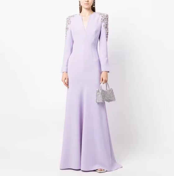 A-line long-sleeved evening dress Estella in lilac with rhinestone appliqués
