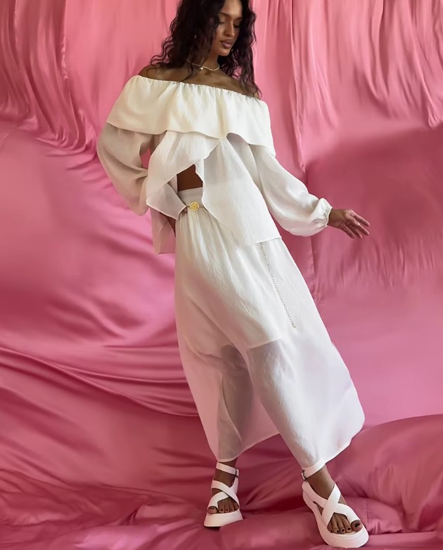 Boho style bridal two-piece set Julika for the civil ceremony: crop top blouse with skirt.