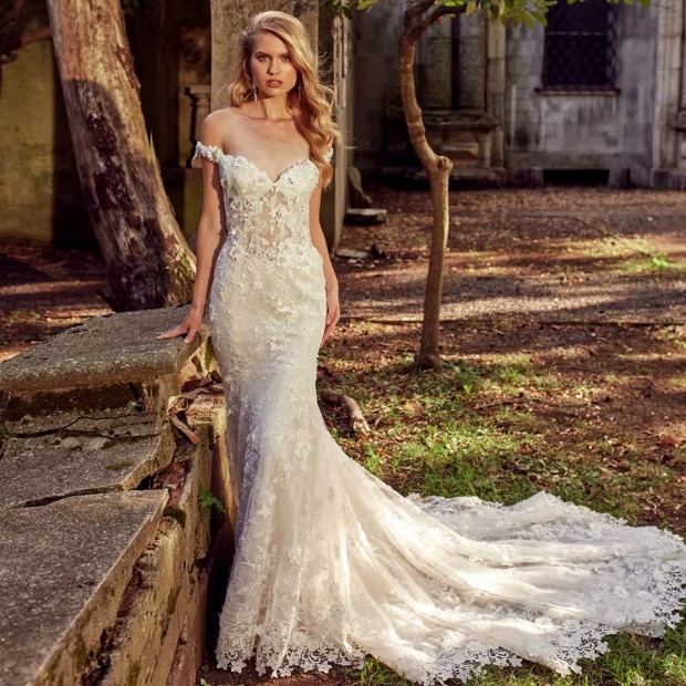 Mermaid wedding dress Evi with floral crystal appliqués, detachable train