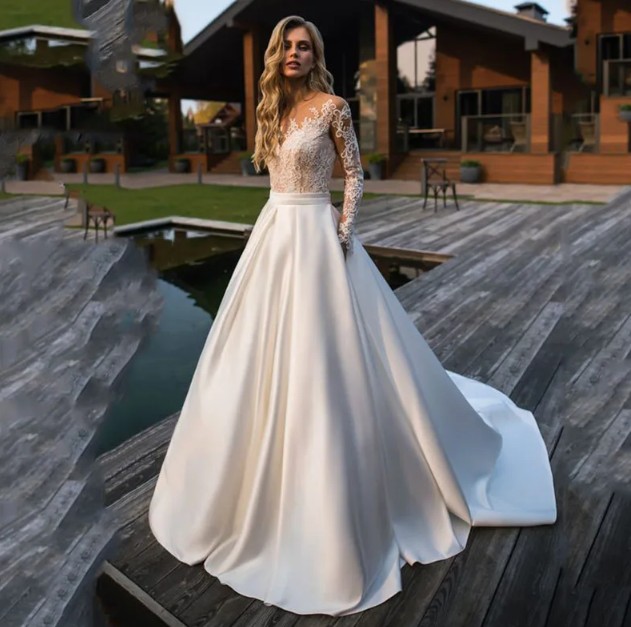 Long-sleeved vintage-style satin wedding dress Eske with lace