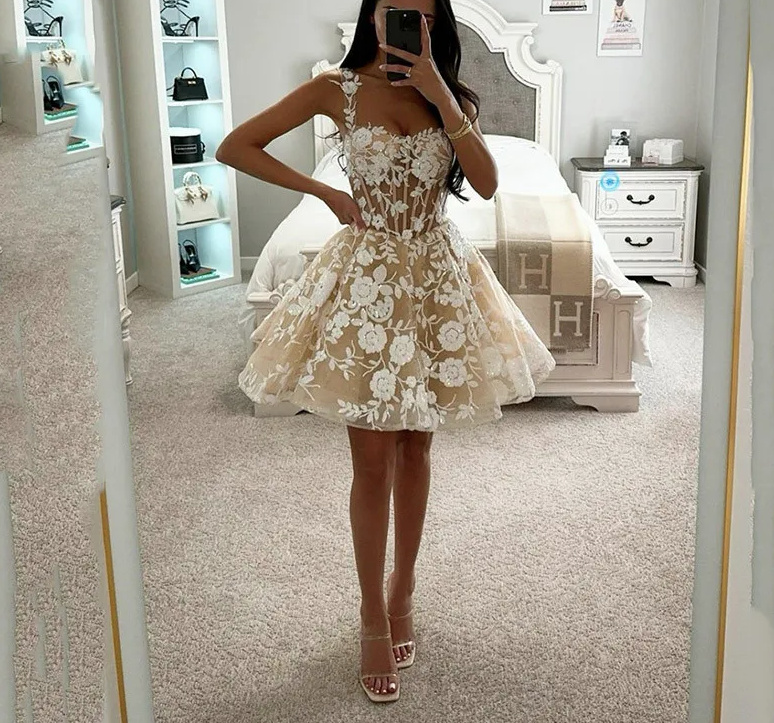 Kurzes A Linie Brautkleid Beate mit Blumen Spitze in Champagne