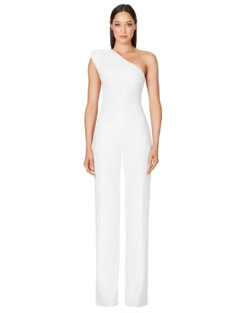 One-shoulder glitter jumpsuit, elegant and festive in white