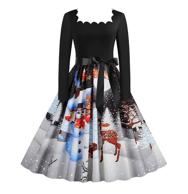 Langarm Vintage-Weihnachtskleid Finette Schwarz Grau mit Motive
