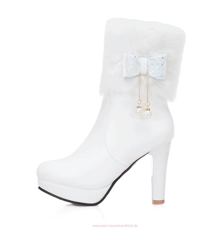 Winter Plateau Braut Stiefeletten Hochzeitsschuhe Elia in Weiß mit Plüsch und Strass Schleife