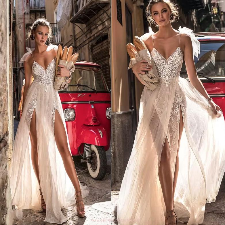 A Linie Boho Brautkleid Elisabet mit Spaghettiträger Spitze und Tüll