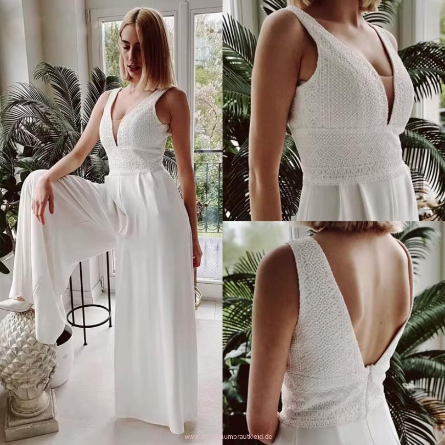 Empire Braut Einteiler Overall Corona mit V Ausschnitt und Spitze