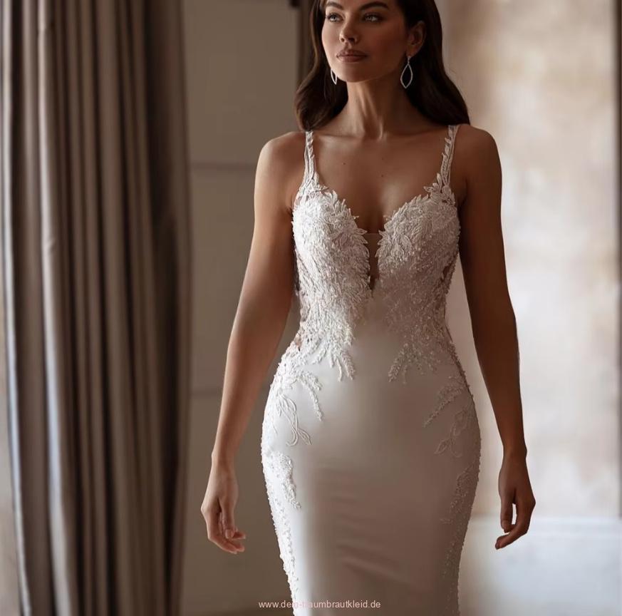 Spaghettiträger Fit and Flare Brautkleid Emmelie mit Spitze und Schleppe