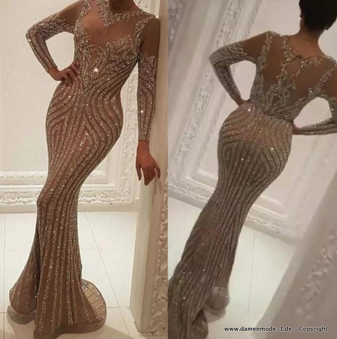 Langarm Glitzer Abendkleid in Gold Mit Pailletten Stickereien