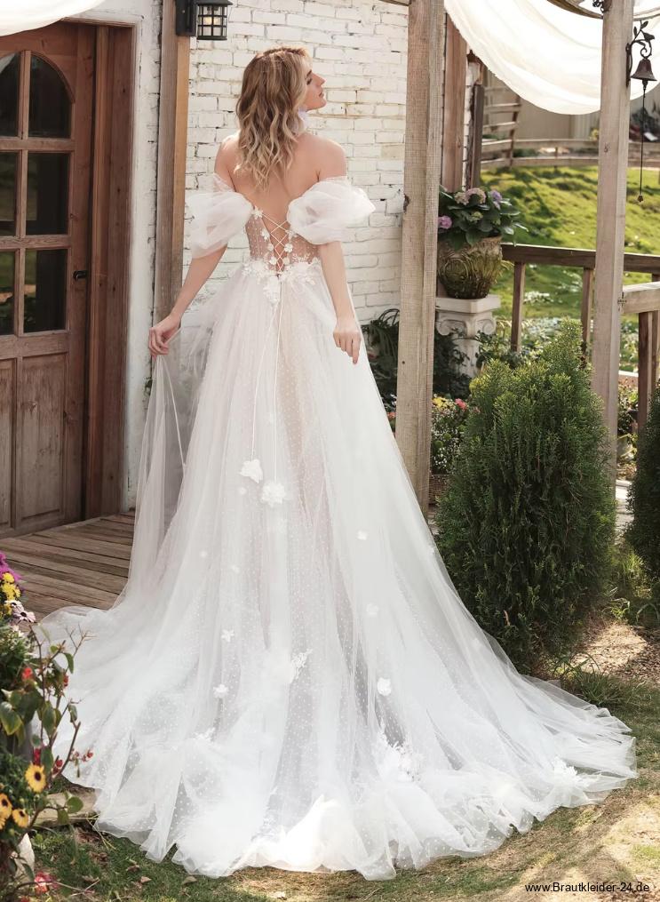 Schulterfreies A Linie Boho Brautkleid Esmeralda mit Lingerie Oberteil Schlitz und Schleppe