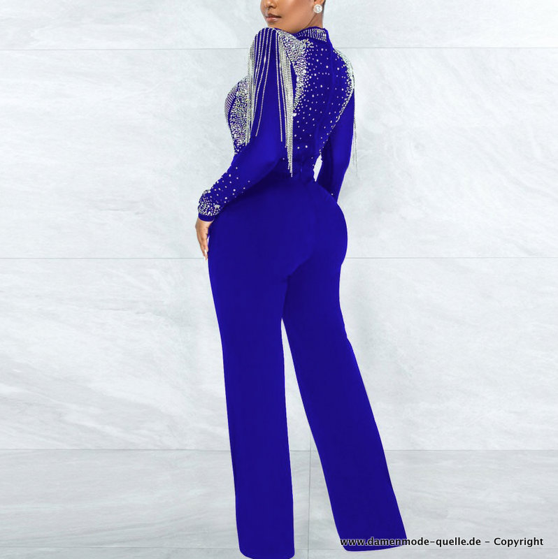 Sexy Jumpsuit Einteiler Lang in Blau mit Diamant Applikationen