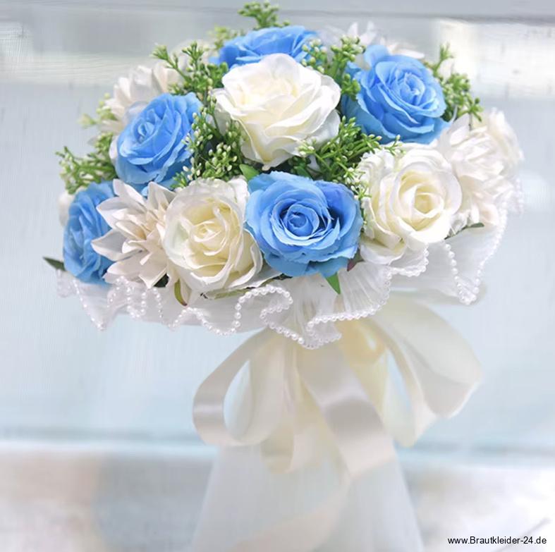 Braut Blumenstrauß Evita Rund in Weiß Blau mit Rosen
